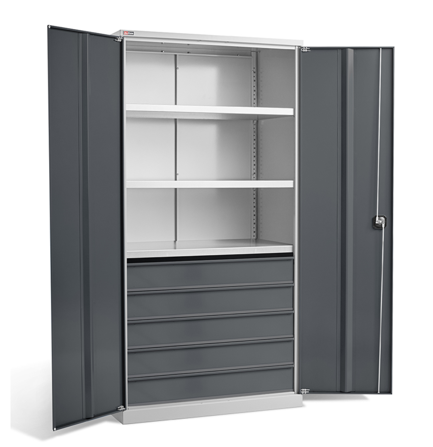 Укомплектован тремя оцинкованными полками и пятью выдвижными ящиками.